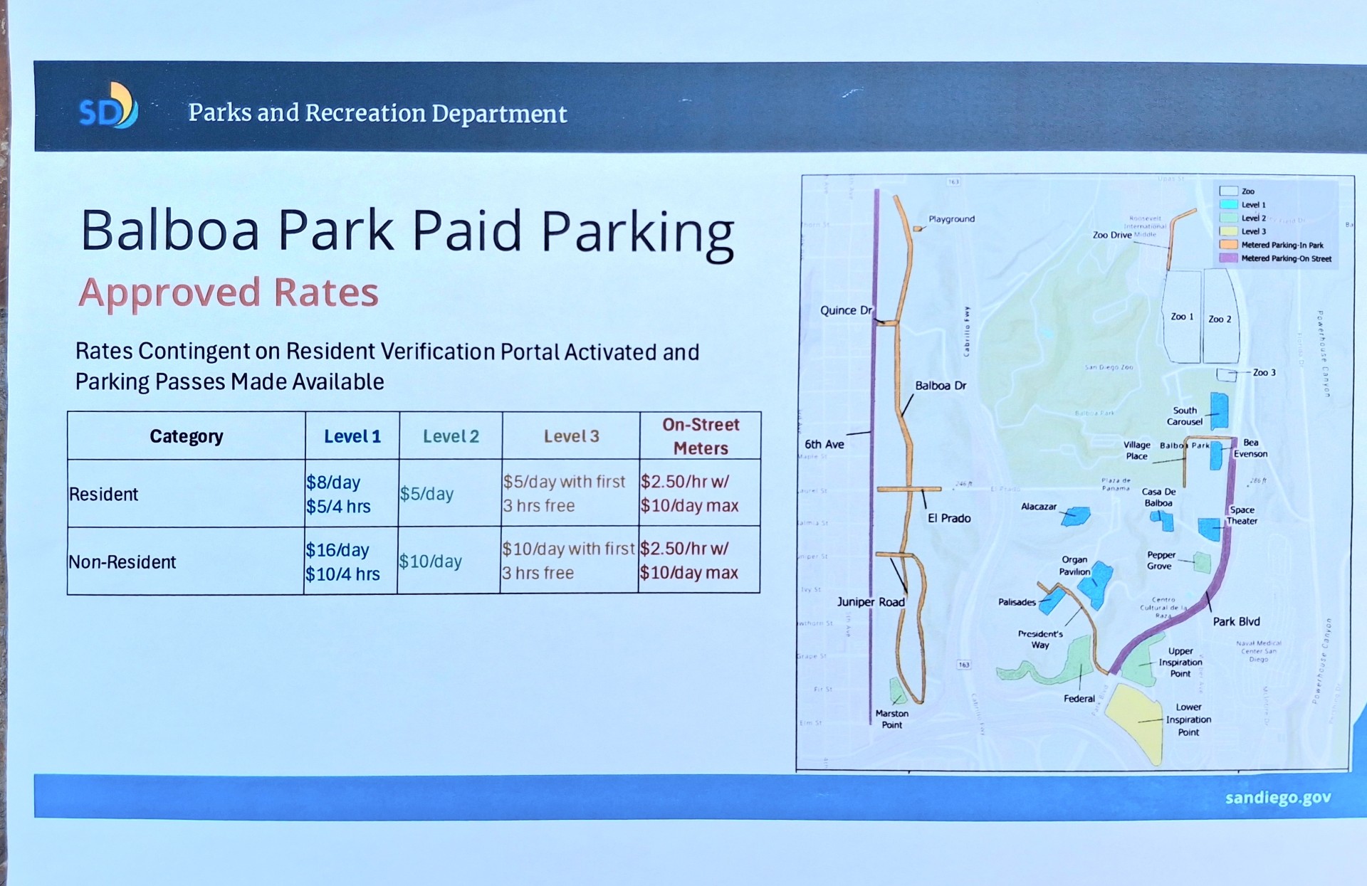 This chart shows the parking locations and proposed fees. For our Balboa Park Activity Center (BPAC) location, there will be Parking Meters on the streets and Parking lots. Our closer lots are highlighted as “Lower (yellow) and Upper (green) Inspiration Point Parking”.